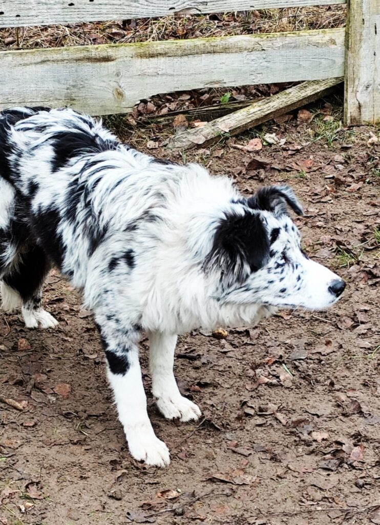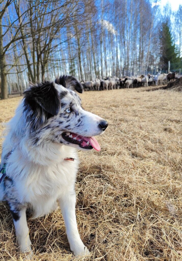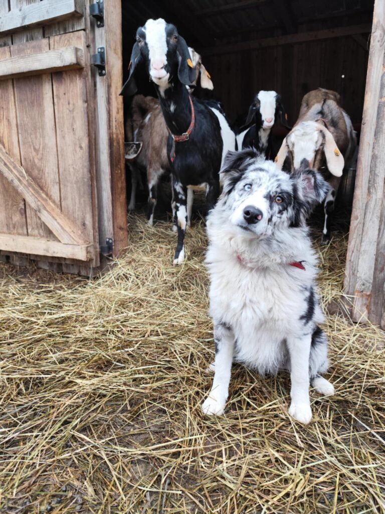 Etna to nasz Ausssie do zadań specjalnych, który ma przede wszystkim pomagać nam przy stadzie 80-ciu kóz i krów. Urodzona 18.06.2024 – nadal jest w treningu i nie chcemy jej zbytnio obciążać mentalnie i fizycznie.